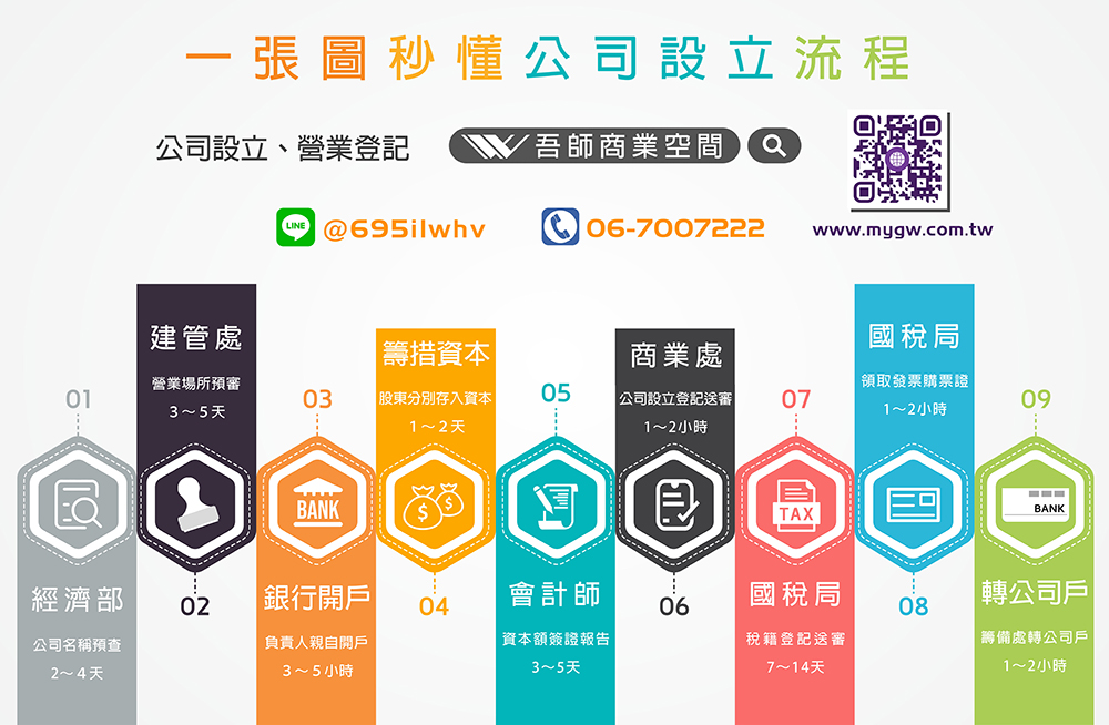 一般完成設址登記約需3-4週(經發局→國稅局時程),會於稅籍登記完成後一個月內開立發票。